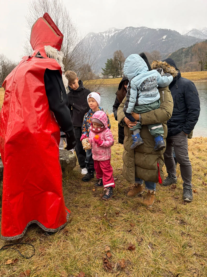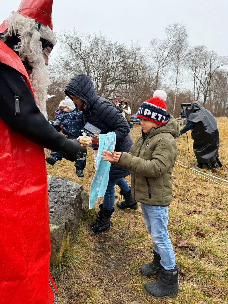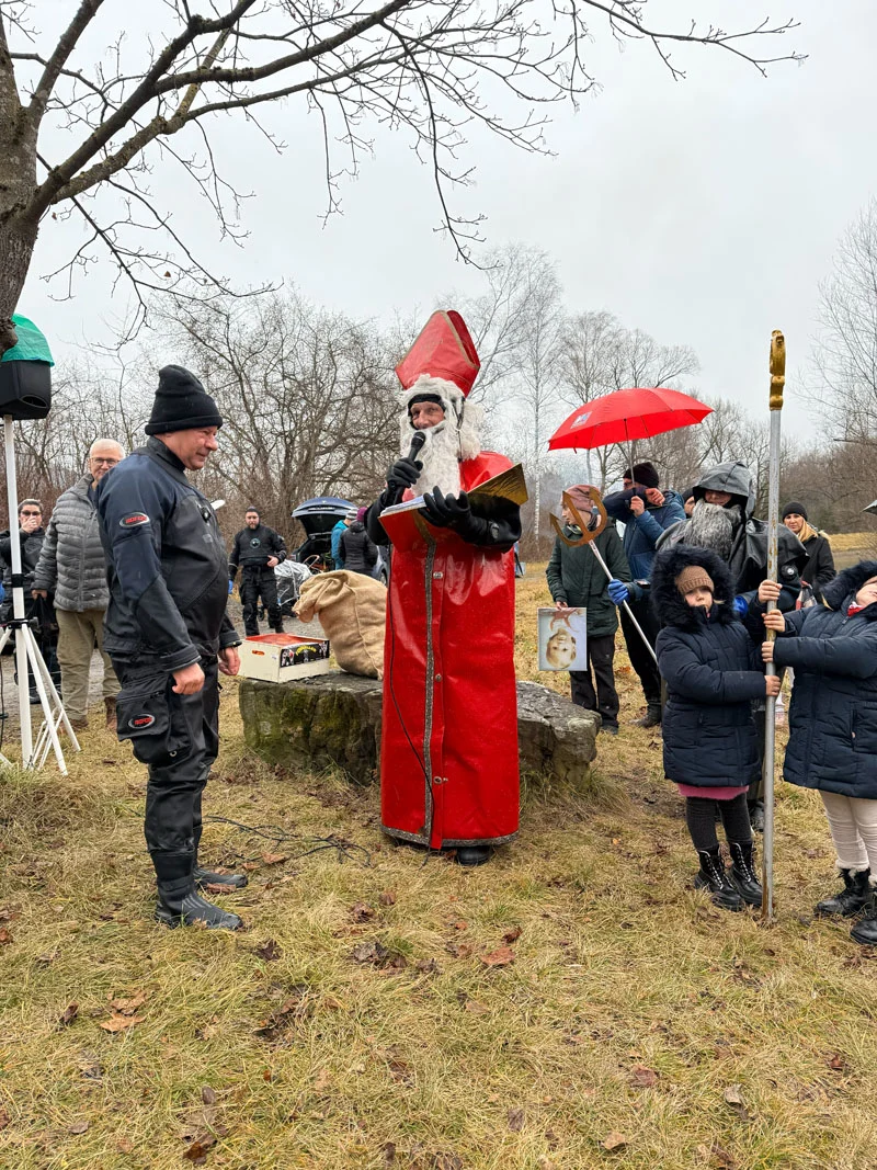 Nach dem gemeinsamen Tauchgang erschien wie gewohnt der Nikolaus, der nicht nur die Kinder mit prall gefüllten Nikolaussäckchen erfreute, sondern auch mit seiner humorvollen Art für viele Lacher sorgte. Gespräche mit Freunden, der Duft von Grillwürsten und wärmende Getränke trugen dazu bei, dass schnell eine gemütliche Stimmung entstand.